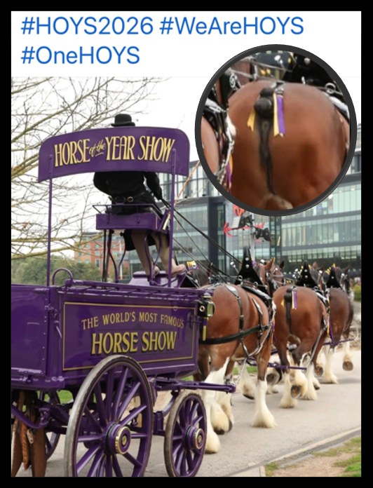 Our stance on this matter is not without merit. Having learned that Alexander (Sandy) Anderson - owner of Grandstand Media which runs the Horse of the Year Show (HOYS) - owns several heavy horses which are stabled in Scotland, and has imported Clydesdales from the US with docked tails, a practice banned in the UK in 1949. These horses were on parade at the recent 2025 HOYS, giving a clear disregard for the horses’ needs to have their intimate and sensitive anatomy protected by their tails, as nature intended.